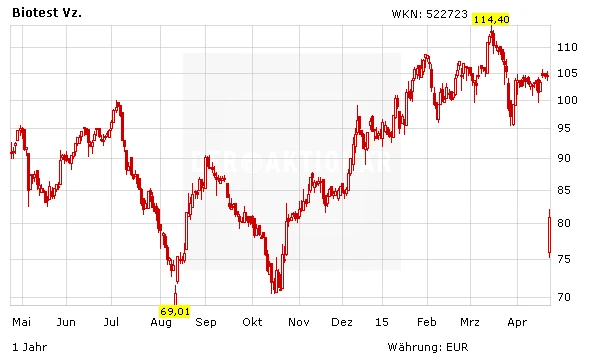 Während die Aktie von Qiagen am Freitag den freundlichen Kurs der vergangenen Monate fortsetzen konnte, muss die Aktie von Biotest einen herben Rückschlag verkraften. Der Wert verlor zeitweise fast 30 Prozent seines Wertes. Der Antikörper Tregalizumab erreichte in einer Phase-IIb-Studie bei Patienten mit mittelschwerer bis schwerer rheumatoider Arthritis den primären Endpunkt nicht, wie das Unternehmen mitteilte. Das BioPharma-Unternehmen AbbVie könne nun innerhalb der nächsten 90 Tage entscheiden, ob die gemeinsame Entwicklung weitergeführt werde. Eine Einstellung der Entwicklung könnte den Gewinn von Biotest 2015 um bis zu 30 Millionen Euro belasten.
