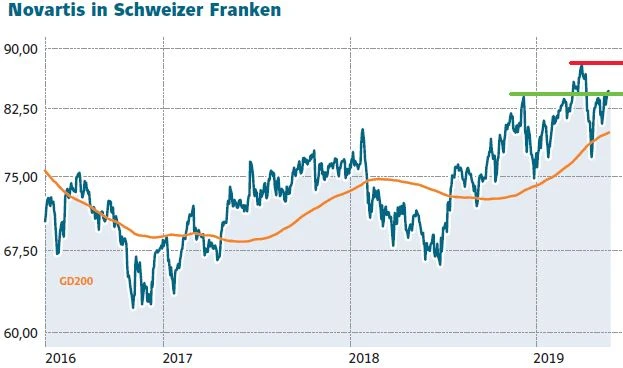 Anleger werden die weiterhin aktionärsfreundliche Dividendenpolitik begrüßen. Derzeit beträgt die Rendite 3,4 Prozent. DER AKTIONÄR bleibt optimistisch, was die weitere Entwicklung der Novartis-Aktie angeht. Die Aktie befindet sich nur noch knapp unter dem Mehrjahreshoch, das vor wenigen Wochen bei 86,54 Schweizer Franken markiert wurde. Rechnet man die Abspaltung von Alcon mit ein – dafür wurden Investoren je 5 Aktien von Novartis 1 Aktie von Alcon in das Depot gebucht –, wäre die Aktie von Novartis längst charttechnisch nach oben ausgebrochen.