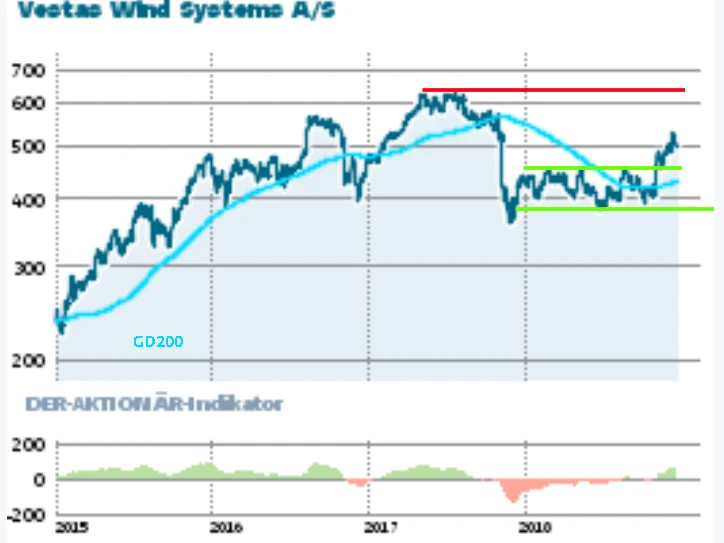 Der Trend bei den Windanlagenbauern zeigt nach oben. Die Aktie von Vestas hat in den letzten Wochen deutlich Boden gutgemacht. Die mehr als zwölfmonatige Konsolidierung wurde mit dem Ausbruch über die obere Widerstandslinie bei 457 Dänische Kronen beendet. Kurz zuvor lieferte die Aktie mit dem Überwinden der 200-Tage-Linie bei 420 Dänische Kronen ein Kaufsignal. Hält der insgesamt positive Newsflow an, kann die Aktie von Vestas im kommenden Jahr durchaus in Richtung der alten Höchststände aus dem Jahr 2017 bei 632 Dänische Kronen heran laufen. Nur der schwache Gesamtmarkt könnte dem Szenario einen Strich durch die Rechnung machen.