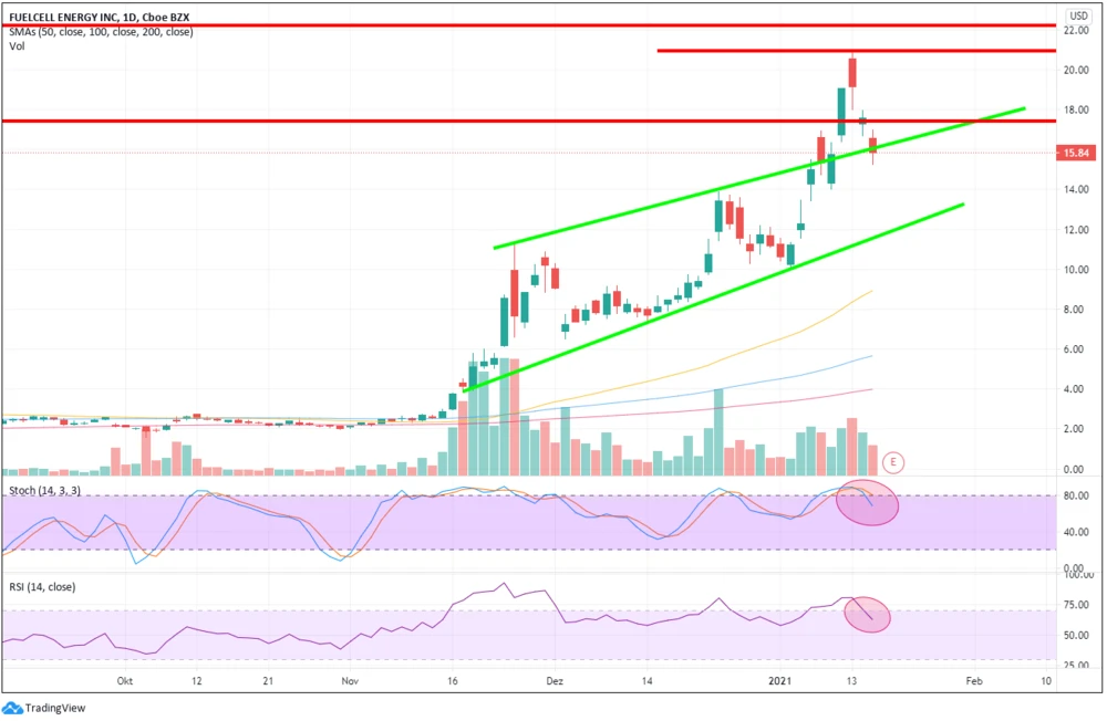 Nachdem die FuelCell-Aktie am vergangenen Mittwoch ein neues Mehrjahreshoch bei 20,94 Dollar markiert hatte, kam es zu einer starken Korrekturbewegung. Ausgehend von diesem Hoch ist der Wert bisher um rund 24 Prozent gefallen. Am Freitag schloss der Kurs nun sogar unter der Begrenzungslinie einer Keil-Formation bei 16,20 Dollar, die der Titel zuvor zwischen November und Anfang Januar ausgebildet hatte (Link).