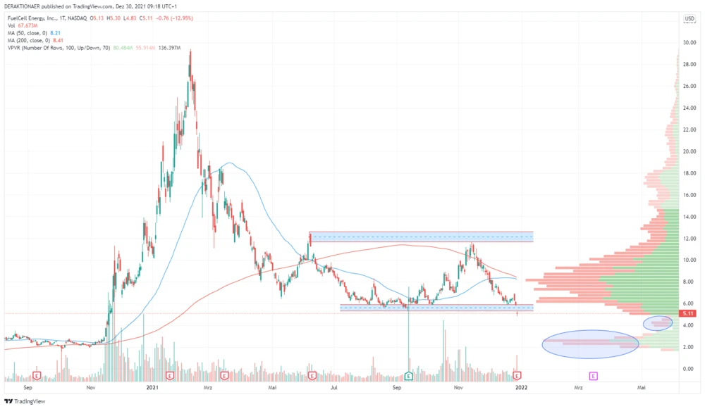 Letzte Woche machte es noch den Anschein, dass sich die FuelCell-Aktie nach dem Abverkauf zwischen Mitte November und Dezember an dem Unterstützungsbereich zwischen 5,34 und 6,00 Dollar fangen kann. Infolge des Abverkaufs nach den Zahlen am Mittwoch notiert sie nun aber deutlich unter dieser Zone und löste damit ein Verkaufssignal aus. Hinzu kommt, dass der Titel jetzt unter den stark gehandelten Preisbereich zwischen 5,00 und 6,60 Dollar gefallen ist.