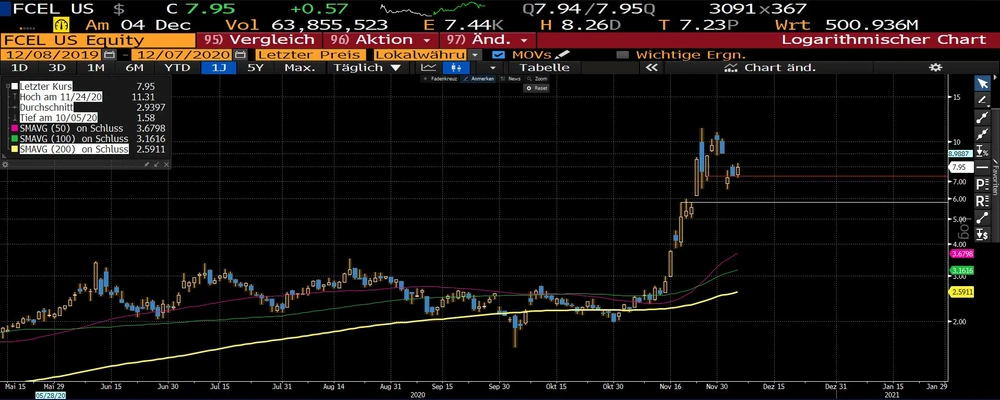 Wie DER AKTIONÄR berichtete, hat FuelCell in der vergangenen Woche rund 130 Millionen Dollar eingesammelt. An der Börse kam dies nicht gut an, die Aktie verlor in der Spitze um 28 Prozent. Doch zum Auftakt der neuen Handelswoche scheinen die Sorgen der Anleger verflogen zu sein: Im deutschen Handel legt die Aktie stark zu. Wird die 7-Euro-Marke nachhaltig überwunden, dürften die Papiere das 52-Wochen-Hoch bei 8,91 Euro ins Visier nehmen.