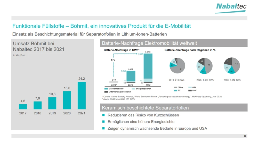 Damit nicht genug: Mit Böhmit hat das Spezialchemieunternehmen noch ein heißes Eisen im Feuer. Diese abgewandelte Form von Aluminiumhydroxid wird auch für die Herstellung von Separatorfolien für Lithium-Ionen-Batterien zur Thermostabilität und damit zur Haltbarkeit eingesetzt. Der noch geringe, aber hochmargige Anteil am Gesamtumsatz dürfte mit einer anziehenden Nachfrage nach E-Autos künftig deutlich steigen.