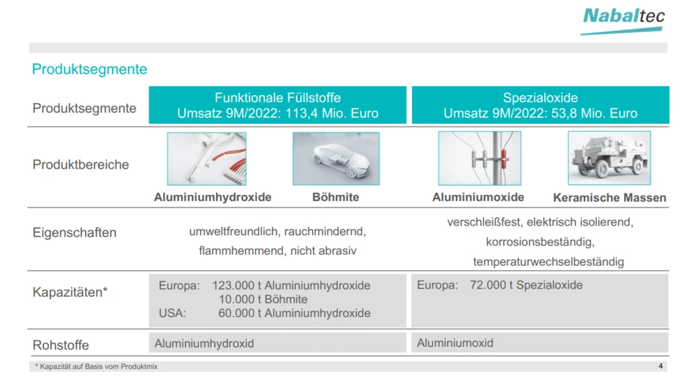 Als Hidden Champion steht Nabaltec nicht im Rampenlicht, profitiert mit seinen flammhemmenden Füllstoffen – unter anderem in Stromkabeln oder Additiven in Farben – und Spezialoxiden zum Einsatz in der Feuerfestindustrie dennoch von neuen Richtlinien in der Industrie und vom steigenden Umweltbewusstsein der Kunden.