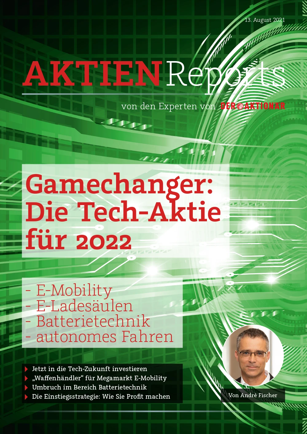 In seinem neuesten Aktienreport „Gamechanger: Die Tech-Aktie für 2022“ geht der Börsenexperte auf einen neuen potenziellen Börsenstar ein, der derzeit mit einer aussichtsreichen Anwendung massive Umwälzungen auslöst. Fischer beschreibt, wie die schlagkräftige Durchbruchstechnologie eine Tech-Revolution in den Zukunftsmärkten E-Mobility, E-Ladesäulen, Batterietechnik und autonomes Fahren einleitet.