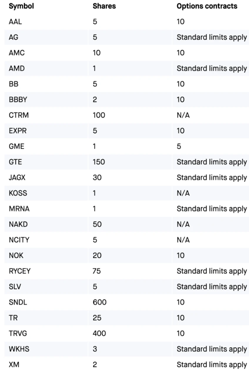 Wer bereits im Besitz von GameStop-Aktien ist, darf demnach nur eine weitere Aktie kaufen. Bei Optionskontrakten ist der Kauf auf fünf beschränkt. Inzwischen hat der Broker die Zahl der „beschränkten Aktien“ zudem von 13 auf 23 erweitert (siehe Liste). Selbst ein etablierter Blue Chip wie AMD steht auf der Liste. Das Eröffnen neuer Positionen ist derzeit zwar möglich, aber ebenfalls begrenzt – inwieweit hier Einschränkungen gelten, war laut CNBC zuletzt noch unklar.
