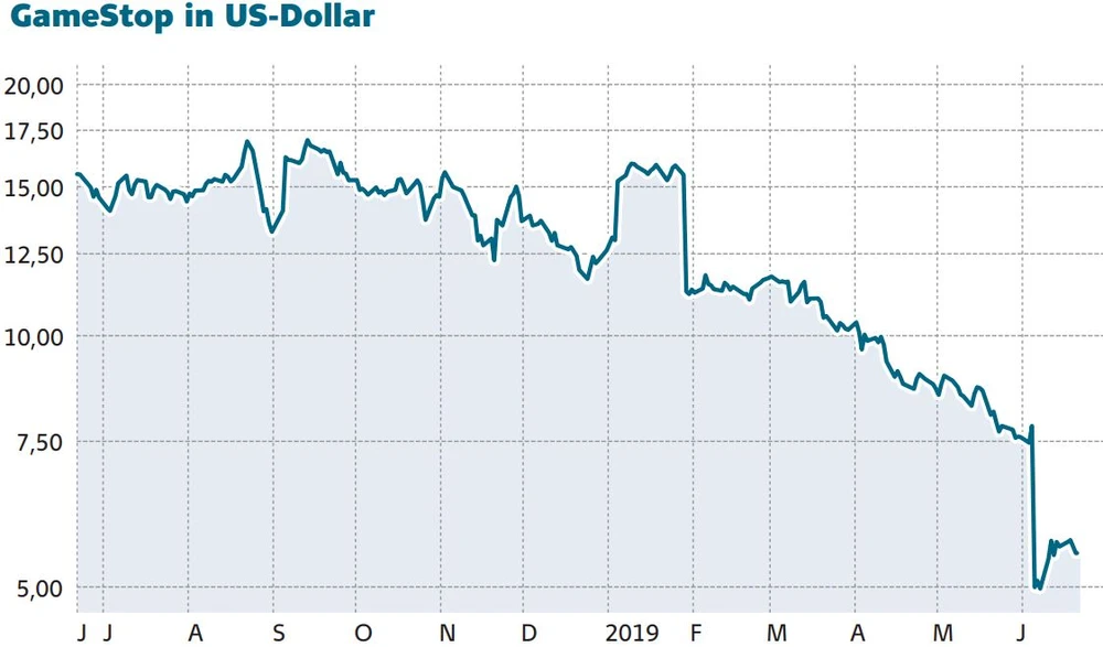 Die Zahlen schockierten Anleger und Analysten gleichermaßen: Der Umsatz von Gamestop fiel gegenüber dem Vorjahr um mehr als elf Prozent auf 1,5 Milliarden Dollar. Noch schlimmer waren die Gewinneinbußen: Hier schlug ein Minus von 75 Prozent zu Buche. An der Börse stürzte die Aktie daraufhin um mehr als 30 Prozent ab.