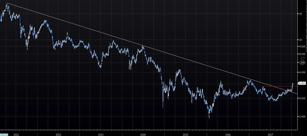 Auch wenn die Aktie des Erdgasriesen in den vergangenen Handelstagen fast schon etwas zu heiß gelaufen ist, stimmt der Blick auf das langfristige Chartbild durchaus positiv. So ist der Aktie erstmals seit 2011 der Ausbruch aus dem Abwärtstrend gelungen. Die Chancen stehen daher gut, dass der Aufwärtstrend der Gazprom-Title nachhaltig ist.
