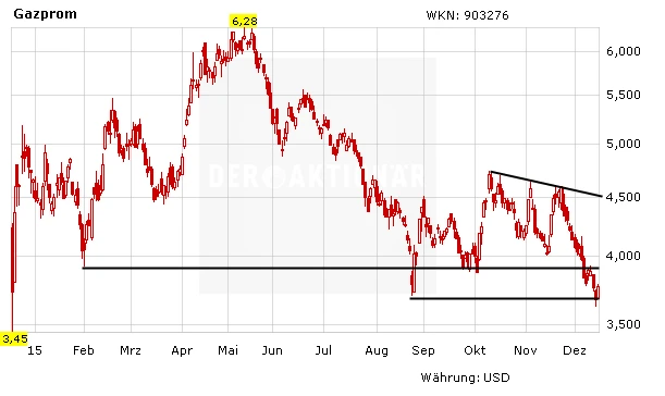 Von den 17 Analysten, die sich regelmäßig mit den Gazprom-Titeln befassen, raten aktuell sechs zum Kauf. Ebenfalls sechs Experten stufen die Aktie mit Halten ein, fünf empfehlen Anlegern den Ausstieg. Das durchschnittliche Kursziel beträgt nun 5,33 Dollar (umgerechnet 4,87 Euro), was mehr als 40 Prozent über dem aktuellen Kursniveau liegt. Anleger sollten hierbei aber im Auge haben, dass der Durchschnitt durch die extrem hohen Kursziele von Bernstein mit 13,00 Dollar und der Gazprombank (ein Schelm, wer Böses dabei denkt…) mit 12,20 Dollar natürlich spürbar verzerrt. Der aktuell am pessimistischsten gestimmte Experte ist Ildar Khaziev von der HSBC. Er stuft die Gazprom-Aktie mit „Reduce“ ein und sieht das Kursziel bei 3,50 Dollar.