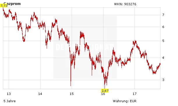 Demnach hat Sberbank-Analyst Alex Fak seine Schätzungen für das kommende Jahr von 1,00 auf 1,10 Dollar je Aktie erhöht (für das laufende Jahr bleib seien Prognose nahezu unverändert bei 0,73 Dollar pro Anteilschein). Nachdem Fak die Gazprom-Papiere bisher mit „Hold“ eingestuft hatte, lautet seine Empfehlung nun „Buy“. Das Kursziel bezifferte er auf 5,50 Dollar (umgerechnet 4,66 Euro), was knapp 26 Prozent über dem aktuellen Kursniveau liegt.