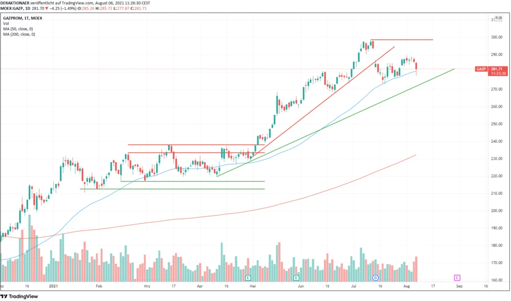 Inzwischen hat sich aber die steile Aufwärtsbewegung wieder abgeflacht. Nach dem rund dreiprozentigen Dividendenabschlag Mitte Juli setzte der Wert noch weitere fünf Prozent bis an die 50-Tage-Linie bei 273 Rubel zurück. Zwar konnte er sich bisher noch nachhaltig über dieser Unterstützung halten, sollte der Kurs aber dennoch darunterfallen, wäre der mittelfristige Aufwärtstrend vorerst auf Eis gelegt. Mit kurzfristigen Rücksetzern bis an die nächste Unterstützung bei 269 Rubel müsste gerechnet werden.