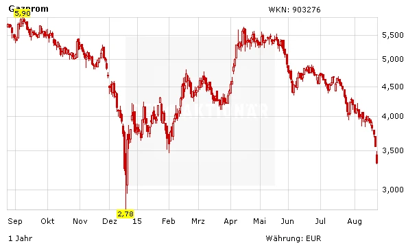 In einem ohnehin sehr trüben Marktumfeld geht es mit den Papieren von Gazprom im heutigen Handel deutlich nach unten. So verbilligen sich die Anteilscheine des weltgrößten Erdgasproduzenten um fast sieben Prozent auf nur noch 3,30 Euro. Was sind die Gründe für das erneute Kursdebakel?