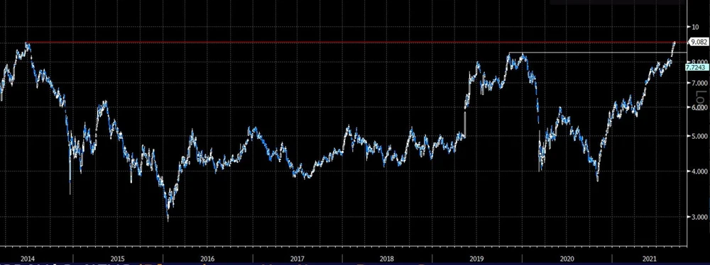 Und im gestrigen Handel wurde auch das 2014er-Hoch bei 9,06 Dollar genommen. Man muss nun bis ins Jahr 2013 zurück, um wieder auf ernstzunehmende Widerstände zu stoßen. Im Bereich zwischen 9,86 und 9,89 Dollar befindet sich dann aber eine vermutlich hartnäckige Hürde, an welcher der Kurs 2013 mehrfach gescheitert war.
