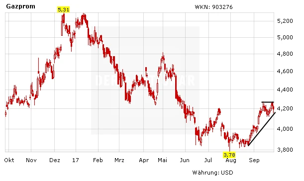 Trotz des Optimismus von Gazprom bleiben bezüglich des Baus und der Finanzierung von Nord Stream 2 noch zahlreiche Fragen endgültig zu klären. Auch deshalb bleibt die enorm günstig bewertete Aktie von Gazprom ein heißes Eisen und ausnahmslos für mutige Anleger geeignet (Stopp: 2,90 Euro).