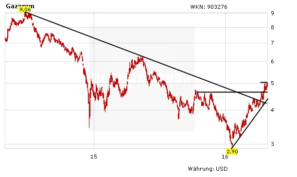 Zudem winkt den Anteilseignern eine satte Dividendenerhöhung. Gazproms Management hat bislang vorgeschlagen, die Ausschüttung von zuletzt 7,20 Rubel auf 7,40 Rubel anzuheben. Die Kreml-Forderung, wonach halbstaatliche Konzerne zur Unterstützung der klammen Staatskassen 50 Prozent des Gewinns ausschütten müssen, würde allerdings eine wesentlich höhere Dividende zur Folge haben. Dadurch wäre sogar eine zweistellige Rendite möglich. Diesbezüglich wird die Entscheidung wohl am 19. Mai fallen.