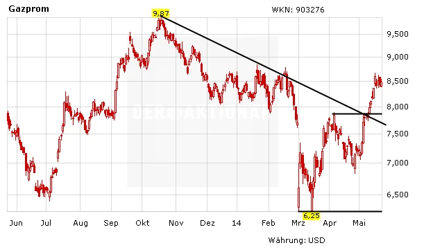 Die enorm günstig bewertete und derzeit auch charttechnisch attraktive Aktie von Gazprom bleibt für mutige Anleger nach wie vor ein klarer Kauf. Der Stoppkurs sollte bei 4,40 Euro platziert werden.