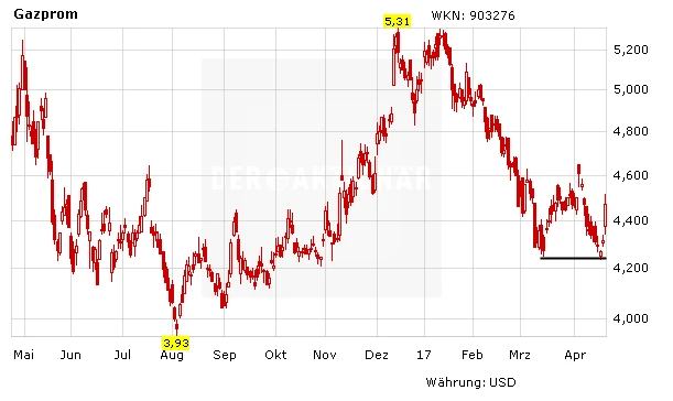 Während Gazprom ein großer Schritt für das Projekt Nord Stream 2 gelungen ist, ist es nun vor allem wichtig, dass sich auch das Chartbild wieder aufhellt. Denn ein Unterschreiten der Zwischentiefs im Bereich von 4,25 Dollar würde für weiteren Abwärtsdruck sorgen. Mutige Anleger, die bei der enorm günstig bewerteten Aktie einsteigen wollen, sollten deshalb noch abwarten, ob die Trendwende gelingt. Wer bereits investiert ist, beachtet den Stopp bei 3,50 Euro.