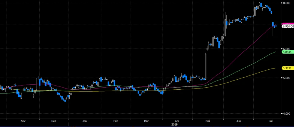 Für den weiteren charttechnischen Verlauf wäre es nun zunächst wichtig, dass der Kurs nicht wieder unter das am Mittwoch markierte Zwischentief bei 6,50 Dollar rutscht. Denn in diesem Fall dürfte sich die Korrektur in Richtung der Unterstützung bei 6,00 Dollar fortsetzen.