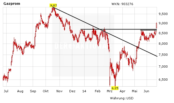 Gazprom hat mit Österreichs Energieriesen OMV einen Vertrag für den Bau der Pipeline South Stream unterzeichnet. Zwar wurde ein Abschluss im Vorfeld bereits erwartet, der Aktienkurs des russischen Gasgiganten legt im heutigen Handel dennoch kräftig zu und hat damit ein weiteres Kaufsignal generiert. Die geplante Pipeline soll ab 2017 durch das Schwarze Meer, Bulgarien, Serbien und Ungarn bis zu 32 Milliarden Kubikmeter Erdgas „liefern“. Einige Politiker der EU-Staaten kritisieren das Abkommen und betonen, dass es rechtlich nicht zulässig sei, dass Gazprom als Produzent auch den Zugang zur Pipeline kontrolliere. OMV-Chef Gerhard Roiss erklärte allerdings: „South Stream wird dem Europäischen Recht voll entsprechen.“