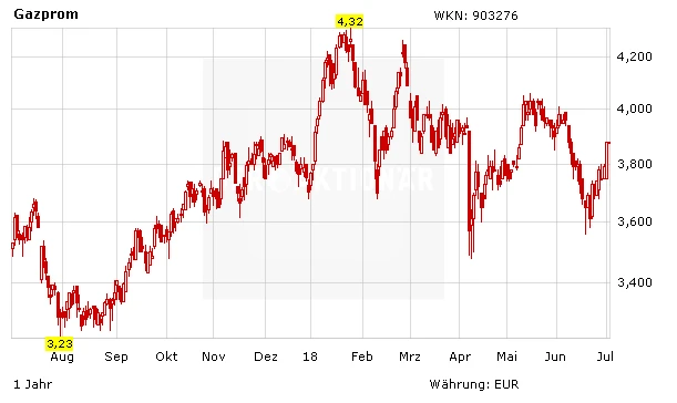 Denn am 18. Juli (Mittwoch) ist der nächste Ex-Tag. Das bedeutet: Anleger, die noch in den Genuss der 2017er-Dividende kommen wollen, müssten die Gazprom-Aktie spätestens bis am 17. Juli gekauft haben. Die Dividende beläuft sich auf knapp 0,21 Euro, woraus sich aktuell eine Rendite von rund 5,4 Prozent errechnet. Die Ausschüttung dürfte wie üblich wieder knapp einen Monat später erfolgen, genauere Zeitangaben liegen derzeit leider noch nicht vor.