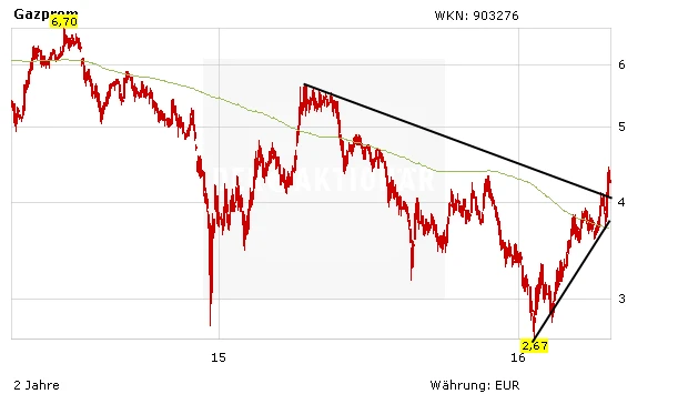 Der Gewinn Gazproms dürfte in diesem Jahr wohl erneut zurückgehen. Dennoch dürfte das KGV deutlich im einstelligen Bereich bleiben. Gepaart mit einem KBV von 0,3 sowie einer Dividendenrendite von mehr als sechs Prozent, ist die Gazprom-Aktie damit ein absolutes Schnäppchen. Dennoch sollten angesichts der hohe Risiken ausnahmslos mutige Anleger zugreifen (Stopp: 2,90 Euro).