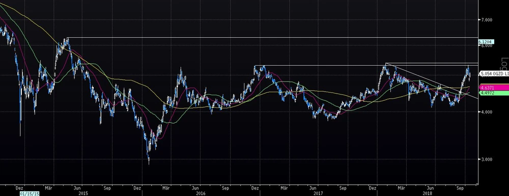 Aktuell notieren die Gazprom-Papiere bei knapp 5,00 Dollar. Der Weg nach oben wäre vorerst frei bis zur Marke von 5,32 US-Dollar (umgerechnet 4,61 Euro), dem aktuellen 6-Monats-Hoch. Sollte es der Aktie gelingen, diese Hürde zu überwinden, lauert der nächste Widerstand dann schon bei 5,38 Dollar in Form des bisherigen 3-Jahres-Hochs. Darüber hinaus wäre allerdings der Weg nach oben komplett frei. Erst bei 6,28 Dollar liegt dann eine neue Hürde.
