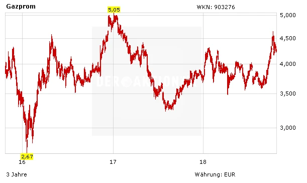 Analysten rechnen aktuell für 2018 mit einer Ausschüttung von umgerechnet 0,21 Euro, woraus sich immerhin stattliche fünf Prozent Dividendenrendite ergeben. Für 2019 wird indes eine kräftige Anhebung auf 0,32 Euro erwartet. Mutige Anleger können jedenfalls nach wie vor bei den Gazprom-Papieren investiert bleiben. Der Stopp sollte bei 3,50 Euro belassen werden.