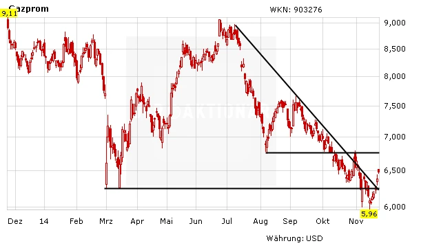 So glückte dem Kurs zum einen der Sprung über den horizontalen Widerstand bei 6,25 Dollar, dem Doppeltief aus dem Frühjahr. Zu anderen glückte auch endlich der Ausbruch aus dem zuvor seit Sommer intakten Abwärtstrend. Aus charttechnischer Sicht hätte die Gazprom-Aktie nun vorerst Luft bis in den Bereich um 6,70 bis 6,80 Dollar.