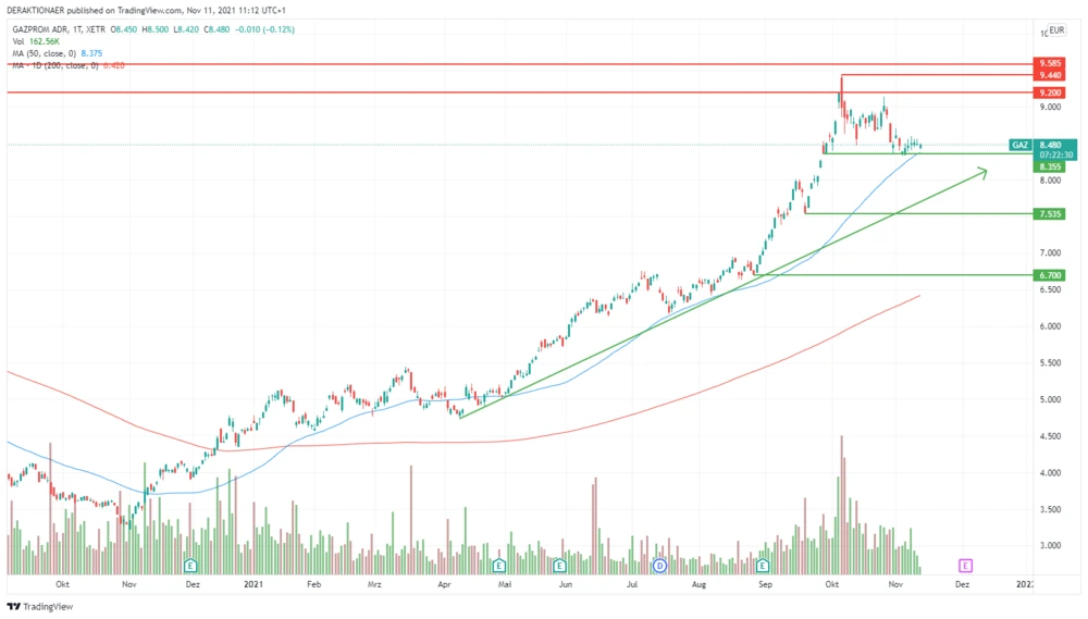 Die Aktie des Energieriesen Gazprom hat nach der starken Rally vorerst eine Pause eingelegt. Die Konsolidierung könnte nun vor ihrem Ende stehen und der Titel weiter Richtung 10-Euro-Marke ziehen. Für die Fortsetzung der Rally sollten investierte und interessierte Anleger jetzt diese Marke auf dem Schirm haben.