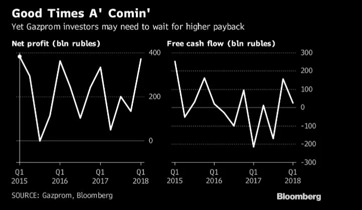 Trotz der positiven Geschäftsentwicklung dürfte unklar bleiben, ob Gazprom für 2018 die Dividende wieder erhöhen wird. Schließlich hat der Konzern hohe Investitionen für den Bau der neuen Pipelines nach China (Power of Siberia), in die Türkei (Turkish Stream) und womöglich auch Deutschland (Nord Stream 2). Daher bleibt dem Vorstand derzeit trotz anhaltend hoher Gewinne wenig Cash Flow zur Ausschüttung an die Anteilseigner übrig, wie aus diesen Grafiken von Bloomberg hervorgeht. Bei welchen Konzernen indes noch 2018 satte Dividendenrenditen von bis zu acht Prozent eingefahren werden können, erfahren Sie hier.