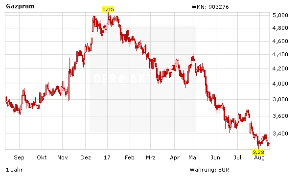 So gehen Analysten davon aus, dass Gazprom im laufenden Jahr auf einen Umsatz von 108,3 Milliarden Dollar kommen dürfte. Während das operative Ergebnis (EBITDA) bei 23,7 Milliarden Dollar liegen dürfte, wird ein Nettogewinn von insgesamt 11,8 Milliarden Dollar beziehungsweise 0,98 Dollar je Aktie erwartet.