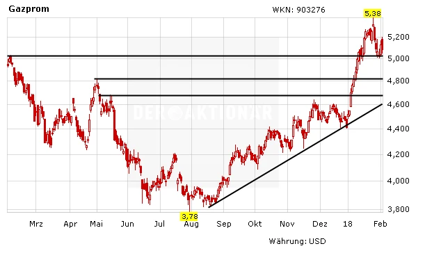 So hat HSBC-Analyst Ildar Khaziev sein Anlagevotum für die Gazprom-Anteile von „Hold“ auf „Buy“ nach oben angepasst. Das Kursziel wurde von 5,00 auf 5,80 Dollar angehoben. Auch Geydar Mamedov von Goldman Sachs sieht derzeit die Papiere des weltgrößten Erdgasproduzenten nun bei 5,80 Dollar (zuvor ebenfalls 5,00 Dollar) fair bewertet, er stuft die Aktie allerdings unverändert mit „Hold“ ein.
