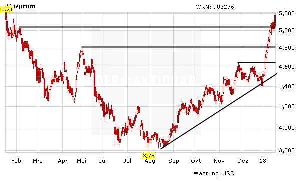 Denn der Chart des Weltmarktführers hat mittlerweile wirklich schon eine Art Fahnenstange ausgebildet. Selbst die jüngste Verschnaufpause bei den Ölpreisen hat an dieser zweifellos für die Anteilseigner erfreulichen Entwicklung nichts verändert. Ein Widerstand nach dem anderen wurde zuletzt aus dem Weg geräumt. Doch früher oder später wird es deutlichere Korrekturbewegung bei der Gazprom-Aktie geben. Grund zur Sorge besteht deshalb aber nicht.