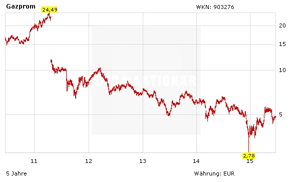 Angesichts eines KGVs von 3, eines KBVs von nur 0,25 und einer Dividendenrendite von fast fünf Prozent sind die Anteile von Gazprom im Vergleich mit Exxon, Shell oder BP ein absolutes Schnäppchen. Wegen der politischen Risiken bleiben die Papiere des russischen Gasriesen aber weiterhin ausnahmslos für mutige Anleger geeignet (Stopp: 4,10 Euro).