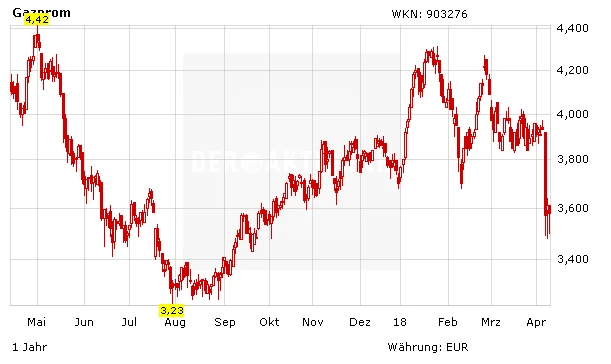 Auf eine nachhaltige Wende beim zuletzt gebeutelten Kurs warten die Anteilseigner von Gazprom aktuell natürlich auch sehnlich. Zumindest zeigte die Aktie wie auch der gesamte russische Aktienmarkt heute und gestern erste zarte Stabilisierungstendenzen. Es bleibt aber dabei: Die Aktie von Gazprom ist ausnahmslos für mutige Anleger mit einem langen Atem geeignet. Diese sollten ihr Investment mit einem Stopp bei 3,20 Euro absichern.