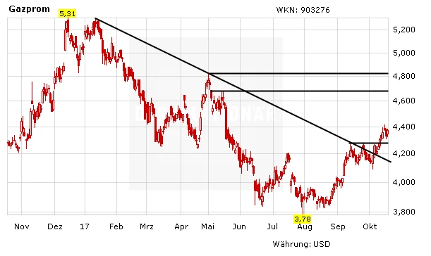Zudem stimmt auch das Chartbild der Gazprom-Titel weiterhin positiv. Der Weg nach oben wäre frei. Die nächsten Hürden liegen bei 4,68 und 4,82 Dollar. Angesichts der enorm günstigen Bewertung (KGV: 4; KBV: 0,2; Dividendenrendite: 6,4 Prozent) wäre aber auch dieses Kursniveau eigentlich noch zu günstig. Mutige Anleger können weiter zugreifen der Stopp sollte bei 2,90 Euro belassen werden.