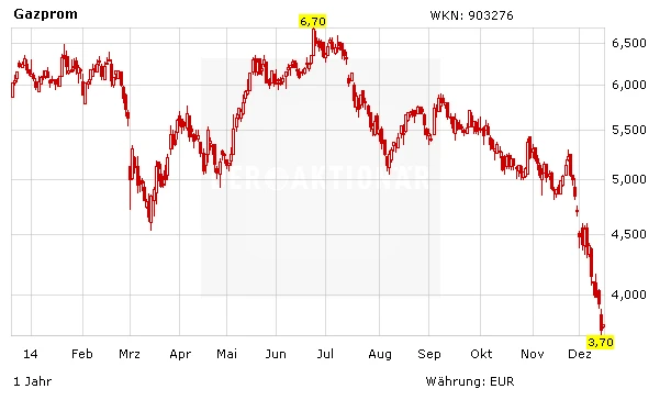 Darüber hinaus wurde das Kursziel für die Gazprom-Titel von 9,50 Dollar auf nur noch 4,75 Dollar halbiert. Allerdings liegt das sogar noch zwei Cent über dem Schlusskurs des letzten Handelstages. Auch Hans Engel, Analyst der Erste Bank Group aus Österreich hat den Daumen gesenkt und die Aktie von „Hold“ auf „Sell“ zurückgestuft. Zusammen mit Ilkin Karimli von der Credit Suisse sind die beiden allerdings derzeit die einzigen, die bei der Gazprom-Aktie zum Verkauf raten. Von den restlichen 20 Analysten empfehlen sieben den Kauf, zehn stufen die Papiere mit Halten ein. Das durchschnittliche Kursziel liegt mit 7,39 Dollar immer noch satte 60 Prozent über dem aktuellen Kursniveau.