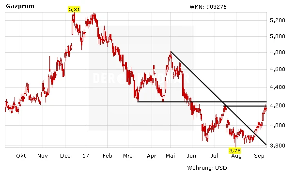 Gelingt es der Gazprom-Aktie, nach dem Ausbruch aus dem Abwärtstrend nun auch den Widerstandsbereich bei 4,20 Dollar zu knacken, können mutige Anleger wieder erste Positionen aufbauen. Die nächsten Hürden auf dem Weg nach oben liegen dann zwar schon wieder bei 4,25 bis 4,27 Dollar. Sollte aber auch diese Marken genommen werden, wäre sogar Luft bis fast 4,60 Dollar. Allerdings ist gerade bei der stets volatilen Gazprom-Aktie natürlich zwischendurch immer wieder mit zum Teil deutlichen Korrekturen zu rechnen.