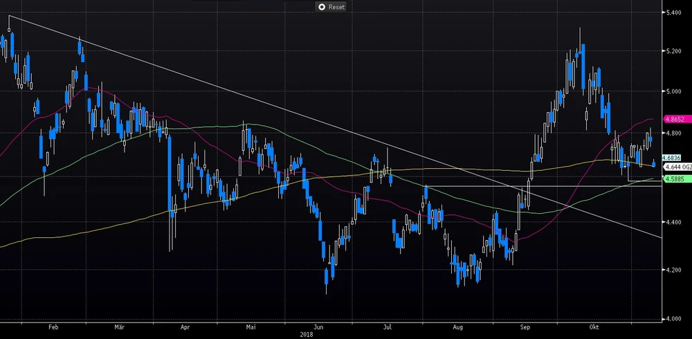 Der heutige Kursrückgang ist indes aus charttechnischer Sicht auch kein Beinbruch. Wichtig wäre, dass der Unterstützungsbereich zwischen 4,56 und 4,58 Dollar weiterhin hält. Mutige Anleger mit einem langen Atem können bei der Gazprom-Aktie nach wie vor investiert bleiben.