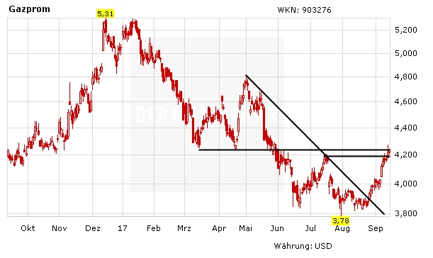 Besonders skeptisch gestimmt ist derzeit Igor Kuzmin von Morgan Stanley, der die Gazprom-Titel mit „Underweight“ einstuft und das Kursziel lediglich auf 3,60 Dollar beziffert. Sehr viel Luft nach oben sieht hingegen Alexander Burgansky. Sein Anlagevotum lautet „Outperform“, der faire Wert liegt seiner Ansicht nach bei 6,00 Dollar.