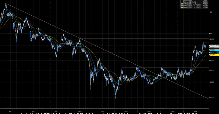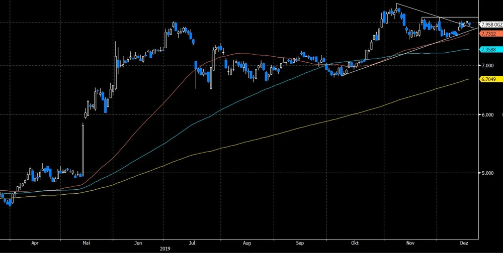 So ist es der Aktie nun gelungen, aus dem kurzfristigen Abwärtstrend auszubrechen. Damit könnte die – aus charttechnischer Sicht absolut gesunde – Konsolidierungsbewegung abgeschlossen sein. Gelingt nun auch noch der Sprung über den Widerstand bei 8,14 Dollar, wäre der Weg nach oben vorerst frei bis zu dem im November markierten Mehrjahreshoch bei 8,50 Dollar.