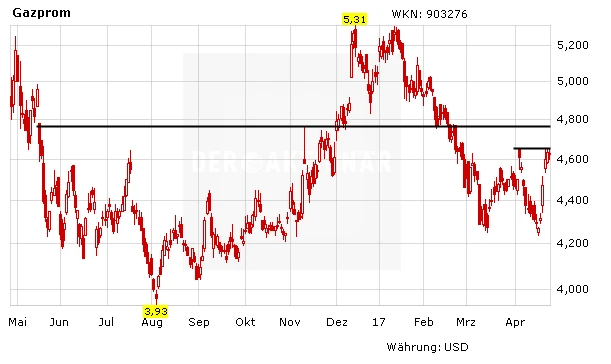 Die zuletzt arg gebeutelte Aktie von Gazprom konnte sich indes wieder etwas erholen. Nun wäre es aus charttechnischer Sicht wichtig, dass auch der Sprung über den Widerstand bei 4,65 Dollar gelingt. Fundamental betrachtet hat die mit einem 2017er-KGV von 4, einem KBV von 0,3 und einer Dividendenrendite von 5,5 Prozent enorm günstig bewertete Aktie ohnehin noch Luft nach oben. Dennoch bleiben die Titel ausnahmslos für sehr mutige Anleger mit einem langen Atem geeignet (Stopp: 3,50 Euro).