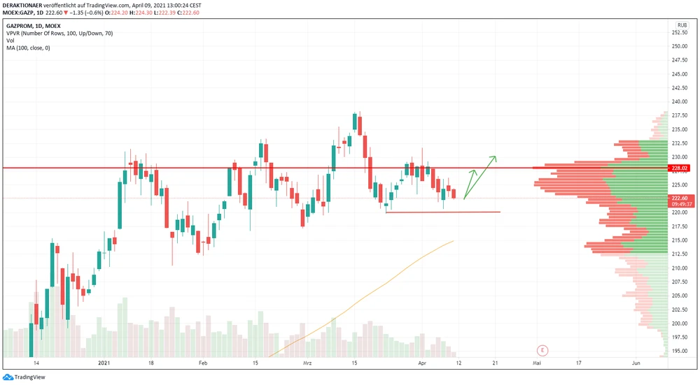 Wem das politische Tauziehen zwischen den USA und Russland zu heikel ist, kann dennoch kurzfristig von den Kursschwankungen profitieren. Das Zauberwort heißt: Range-Trading. Dabei nutzt der Trader das Auf und Ab und den sogenannten Point-of-Control (PoC). Wie im Chart an der roten Linie erkennbar ist, befindet sich der PoC bei 228,03 Russische Rubel (entspricht 5,02 Euro). Zu diesem Preis haben die meisten Aktien seit Jahresbeginn den Besitzer gewechselt. Anleger betrachten das Level also als fair.