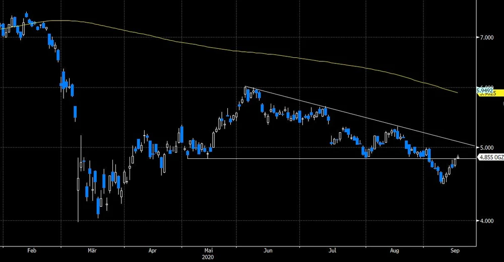 Doch an den vergangenen Handelstagen hat sich der Kurs nun wieder deutlich erholen können. In dieser Woche gelang zumindest schon einmal der Sprung über die wichtige Marke von 4,84 Dollar. Nun könnte es bald zu einem Ausbruchsversuch aus dem Abwärtstrend, der aktuell bei 5,10 Dollar verläuft (und bis Ende September etwa 5,00 Dollar liegen dürfte) kommen.