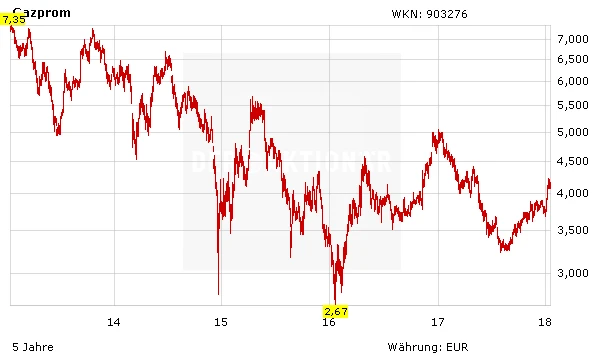 Die Lieferverträge mit Indien und China sorgen mittel- bis langfristig für deutliches Aufwärtspotenzial bei Gazproms Umsätzen und Gewinnen – und damit natürlich auch für den Aktienkurs. Die mit einem KGV von 4, einem KBV von 0,3 und einer Dividendenrendite von über fünf Prozent immer noch günstig bewerteten Gazprom-Titel bleiben für mutige Anleger unverändert ein Kauf. Der Stoppkurs sollte auf 3,20 Euro nachgezogen werden.