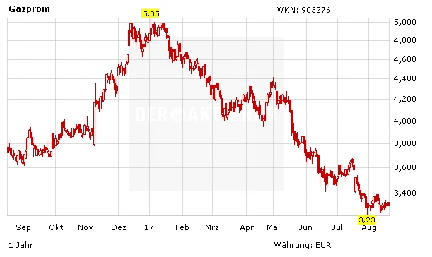 Es gibt jedoch auch negative Meldungen für Gazprom-Aktionäre: So ist etwa der Gaspreis mit nur noch 5,76 Cent je Kilowattstunde nun auf den tiefsten Stand seit 2005 gefallen. Ähnlich wie beim Erdöl gibt es weltweit einfach ein Überangebot an Erdgas, das wohl noch längere Zeit auf den Preisen lasten könnte.
