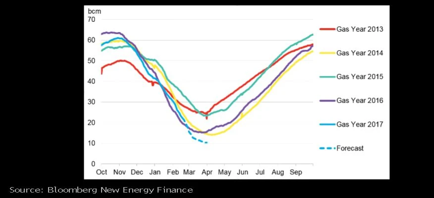 Wie der Nachrichtendienst Bloomberg meldet, dürfte die sibirische Kälte dazu führen, dass die Gasnachfrage im Nordwesten Europas sowie in Italien um zusätzliche 3,6 Milliarden Kubikmeter steigen wird. Dies dürfte den Experten von BNEF zufolge dazu führen, dass die Lagerbestände in Europa damit auf ein neues Mehrjahrestief sinken dürften.