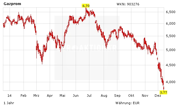 Darüber hinaus hat sich das Marktumfeld natürlich in vielerlei Hinsicht erheblich eingetrübt. Ausländische Investoren ziehen derzeit massiv Kapital aus Russland ab. Dadurch wird es für russische Unternehmen natürlich immer schwieriger, sich zu refinanzieren. Vor allem ist es äußerst schwierig, sich günstig zu refinanzieren. Zudem muss Gazprom mit den beiden Pipelines nach China sowie der Pipeline in die Türkei in den kommenden Jahren Investitionen im mittleren zweistelligen Milliarden-Dollar-Bereich stemmen. Eine geringere Ausschüttung des 2014er-Gewinns wäre daher natürlich verständlich.