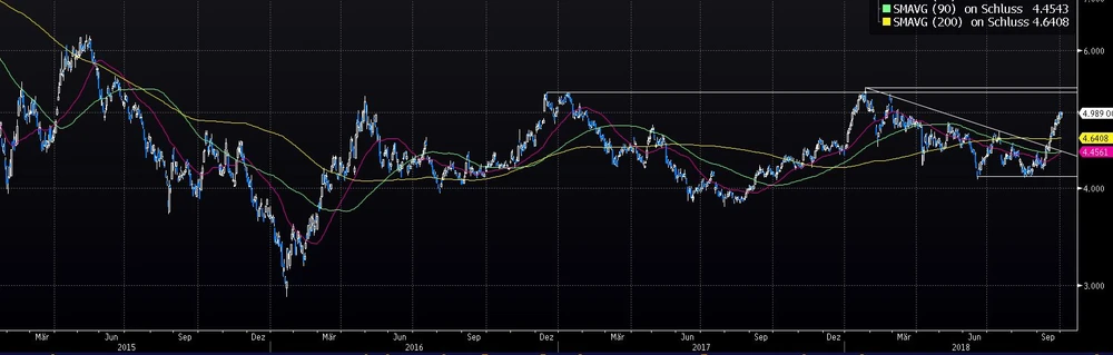So konnten die Gazprom-Papiere innerhalb von drei Wochen satte 20 Prozent auf nun 4,99 Dollar zulegen. Aus charttechnischer Sicht wird es nun spannend: Gelingt es der Aktie nun auch noch, die beiden Widerstände bei 5,27 und 5,38 Dollar zu überwinden, wäre anschließend Luft nach oben bis zur Marke von 6,27 Dollar. Nach unten wird die Aktie von der Unterstützung bei 4,70 Dollar abgesichert.