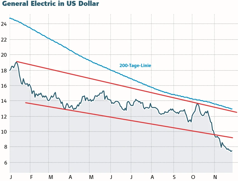 Die GE-Aktie scheint nach dem erneuten Absturz auf den ersten Blick günstig, doch die Risiken bleiben weiter hoch. DER AKTIONÄR hat in Ausgabe 42/18 auf fallende Kurse der Industrieikone gesetzt. Der Schein notiert mittlerweile über 90 Prozent im Plus. Anleger lassen die Gewinne laufen und ziehen den Stopp auf 10,50 Euro nach.
